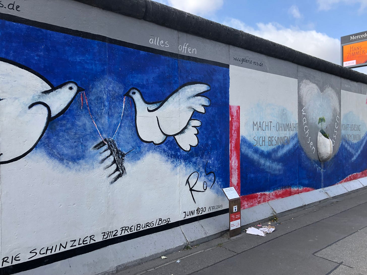 Ebenfalls 35 Jahre alt geworden ist die Eastside Gallery in Berlin. Dabei handelt es sich um einen von Künstlerinnen und Künstlern bemalter Mauerstreifen ungefähr zwischen Oberbaumbrücke und Ostbahnhof. Vor 1990 befand sich hier das Grenzgebiet zwischen West- und Ost-Berlin.